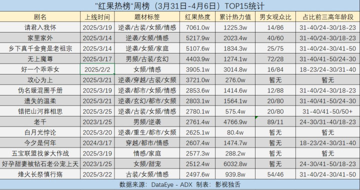 以上周(3月31日-4月6日)“短剧热力榜”前几名为例。